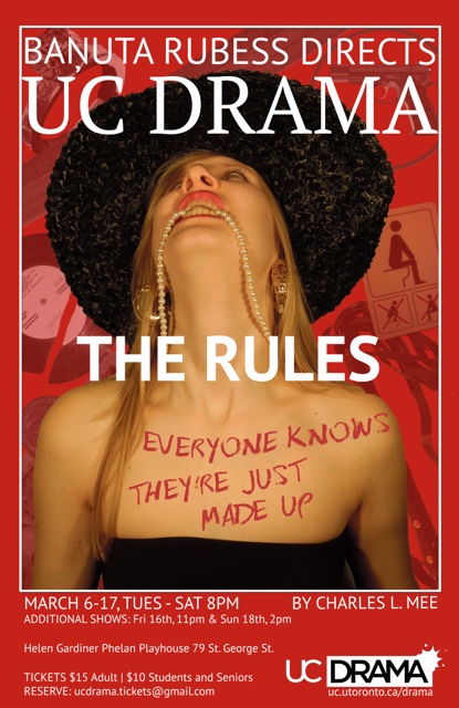 Between 2010 and 2020, I directed six productions at two Canadian universities. I adapted the sexual politics of Aphra Behn’s The Rover to Harvey Weinstein’s Hollywood for a production at Ryerson University. At the Centre for Drama at the University of Toronto, I staged a contemporary version of an 18th century German potboiler, Katie of Heilbronn: An Obsession by Mr. Heinrich von Kleist; guided students in devising an homage to Videocabaret with a show about Yorkville Avenue called Around the Block; adapted a novel by Virginia Woolf with students and called it You Are Invited to the Cast Party after the Production Formally Known as Mrs. Dalloway; delved into an immersive, devised rendition of The Rules, a play by American playwright Charles Mee; and shook the stage with Howard Barker’s The Possibilities.